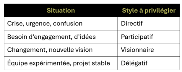 À ce sujet, peu importe le style dominant d’un leader, il doit combler sa lacune dépendamment du contexte :